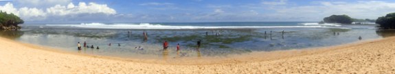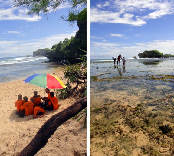 Menuju Wonosari dari bandara Adi Sucipto dibutuhkan waktu kira-kira 2 jam . Sebelum memasuki daerah pantai akan melewati perbukitan dengan kawasan hutan lindung. Pantai pertama yang kami kunjungi adalah pantai Kukup. Pesona goa kecil ditepi pantai serta hamparan pasir yang menguning menjadi daya tarik pantai ini. Bagi anda pecinta ikan hias , di sini terdapat aquarium air laut yang bisa menjadi objek wisata belajar anak. Cukup lama kami di pantai kukup, melewati waktu bersama dengan buka “bontot’ dan acara foto keluarga :p.
