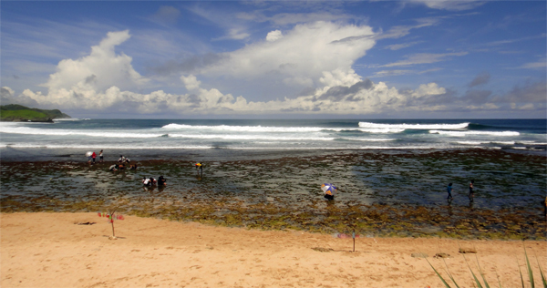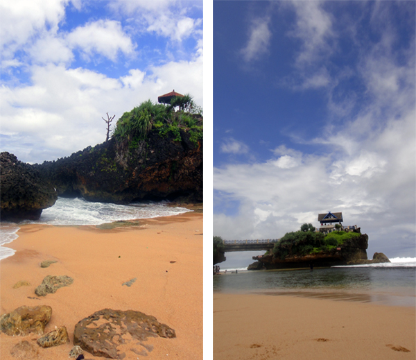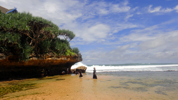 Menuju Wonosari dari bandara Adi Sucipto dibutuhkan waktu kira-kira 2 jam . Sebelum memasuki daerah pantai akan melewati perbukitan dengan kawasan hutan lindung. Pantai pertama yang kami kunjungi adalah pantai Kukup. Pesona goa kecil ditepi pantai serta hamparan pasir yang menguning menjadi daya tarik pantai ini. Bagi anda pecinta ikan hias , di sini terdapat aquarium air laut yang bisa menjadi objek wisata belajar anak. Cukup lama kami di pantai kukup, melewati waktu bersama dengan buka “bontot’ dan acara foto keluarga :p.