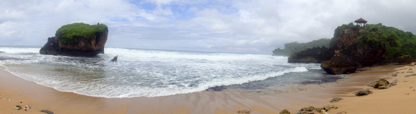 Wisata kali ini berubah 18o derajat, berniat solo backpacking menyusuri wisata alam dan budaya Jogjakarta menjadi acara family gathering dan temu kangen. Dengan penerbangan Air Asia , pukul 07:00 sampailah saya di bandara Adi Sucipto. Rencana awal setelah sampai di bandara saya akan menuju Candi Kalasan dan Prambanan untuk wisata budaya dengan menumpang busway. Namun semuanya berubah setelah tante yang tinggal di Jogja menelepon kemaren sore. Keluarga besar di Jogja akan menjemput saya lalu mengajak “plesiran” ke pantai yang ada di Wonosari. Setelah satu jam menunggu di bandara sambil sarapan dan online, akhirnya perjalanan menuju pantai Wonosari dimulai. Bule bersama sepupu dan keponakan menjemput di bandara. Sebetulnya pantai wonosari tidak ada di itinerary trip kali ini. Sempat sekilas mencari informasi di internet bahwa banyak sekali pantai yang masih alami di Gunung kidul. Tercatat lebih dari 10 pantai yang dijadikan obyek wisata di kawasan ini.