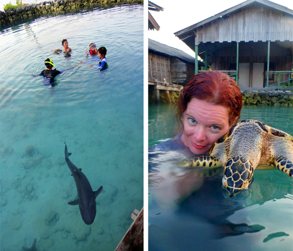 Menjelang sore hari kami kembali menuju arah barat ke Penangkaran Hiu. Karena high season untuk bisa bersandar di penangkaran hiu kapal harus antri. Waktunya uji nyali nih. Berani berenang di kolam hiu? Awalnya saya tidak berniat untuk masuk kolam hiu karena kaki dan tangan saya luka terkena karang api. Tapi karena penasaran akhirnya sayapun ikut menceburkan diri ke kolam hiu dan berfoto dengan kura kura laut. Di sini kita tidak hanya dapat melihat hiu saja, tapi beragam hewan laut seperti ikan buntal dan ikan krapu.