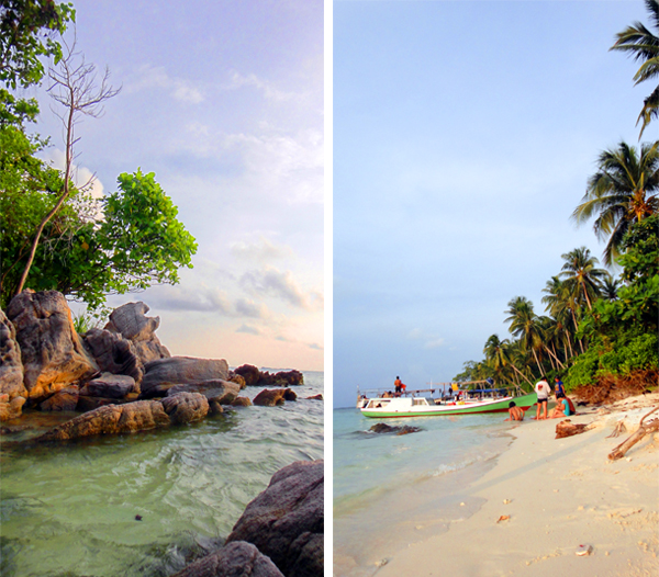 Karena laut surut dan kapal tidak bisa sandar  untuk mencapai pulau Cemara Kecil kamipun harus berjalan menyusuri pulau berpasir seperti pulau gosong sejauh 200 meter. Pemandangan Cemara kecil yang terbaik untuk hari ini. Dengan latar belakang gunung serta langit dan laut yang benar benar biru, rasanya seperti berada di Hawaii. Lagi-lagi pose andalan pun dimainkan…., loncat di udara, berjemur di pantai :p