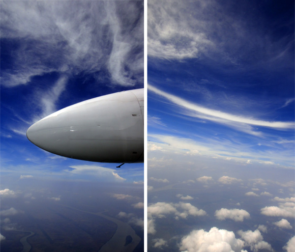 Meskipun di awal penerbangan agak sedikit turbulensi , tapi saya cukup menikmati pernebangan kali ini. Dari jendela saya dapat menyaksikan indahnya propinsi Sumatra Selatan. Tampak aliran sungai Musi serta rajutan awan di angkasa yang menggoda saya untuk mengeluarkan kamera pocket.