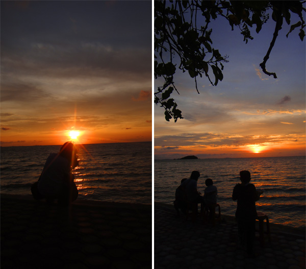 Setelah melewatai perjalanan satu jam lebih dari bandara, kamipun sampai di Pantai Tanjung Pendam. Tak sabar rasanya melihat hamparan rona kuning di batas garis horison. Semua jenis kamera pun beraksi mengabadikan momen alam yang kerap berulang tapi selalu dinanti. Model dadakan pun muncul, bermain main dengan siluet.