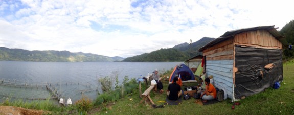 Di sini ada satu bukit yang menjorok ke danau. Awalnya kami ingin mendirikan tenda di sana tapi karena angin berhembus agak kencang tenda kami bangun di belakang pondok pak Iwan. Pak Iwan merupakan sosok pria yang menyenangkan. Pria paruh baya ini banyak bercerita tentang pengalaman hidupnya.