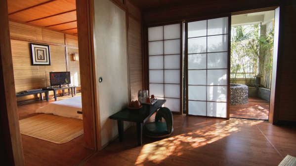 Meski konon Japanese Room , ruangan favorit merayakan aniverrsary wedding saya tetap memilih kamar tanpa ranjang. Rasanya tidur di atas lantai lebih rileks  mampu mengendorkan otot punggung . Jacuzzinya itu lho, agak-agak butuh nyali. Meski tertutup tumbuhan bambu tetap berasa seksi banget berendem di luar teras depan. *siapin bikini*
