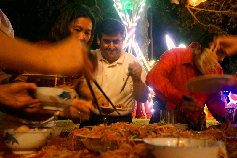 Paling unik ketika Yee Sang diramu bersama-sama dalam wadah besar oleh beberapa orang. Potongan sayuran berhamburan di udara bersama sumpit yang mengayun.