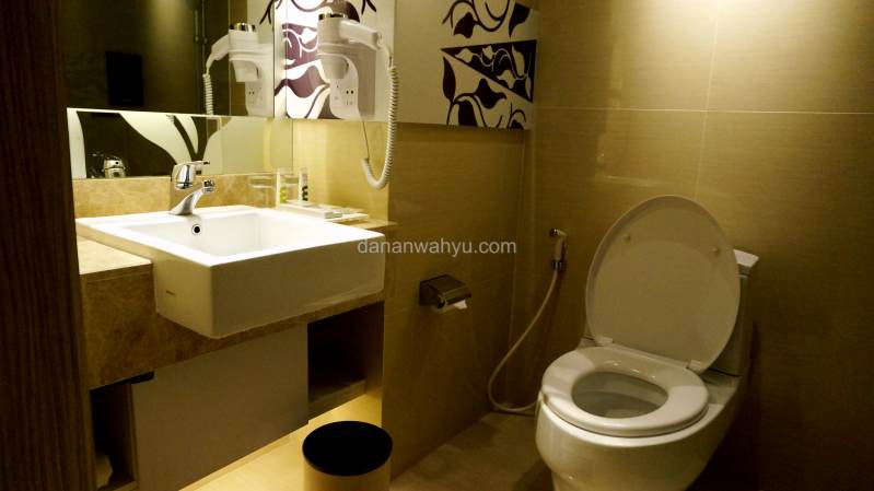 Kebersihan kamar mandi standar hotel bintang 4. Tak ada bathtube hanya shower air hangat. Cukup bagi tamu yang lebih banyak menghabiskan waktu di luar kamar atau melakukan perjalanan bisnis 3-4 hari.