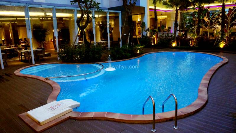 Restoran dan Kafe berada di sisi kanan dengan konsep penerangan lebih teduh dibandingkan lobi. Ada jalan penghubung ke kolam renang yang berada tepat di belakang resepsionis bersekat kaca.