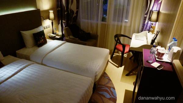 Mari kita kulik kamarnya. Seperti dugaan saya sebelumnya, tidak terlalu luas dengan interior minimalis. Tapi beruntung masih ada lemari, tidak seperti Aston Jambi yang hanya ada tempat menggantung pakaian.