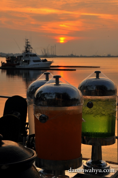 Tidak menyangka kalau acara melepas tali kekang lambung jadi begitu romantis. Sebelum adzan berkumandang , rona jingga memenuhi langit dan permukaan air laut. Ruang makan terbuka yang merupakan anjungan menjorok ke laut mendadak jadi lokasi selfie.