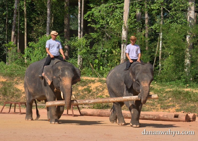 Dipandu oleh pawang gajah-gajah ini bekerjasama mengangkat batang kayu. Dahulu kala tenaga gajah yang besar dimanfaatkan untuk mengangkat kayu dari dalam hutan.