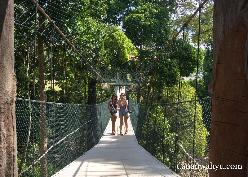 Tapi tunggu dulu. Setelah melewati tempat penjualan tiket pengunjung diajak ke atas menara yang tingginya 6 meter. Dari sinilah petualangan dimulai. Pertama-tama kita diajak melintasi jembatan gantung yang melintas di atas sungai.