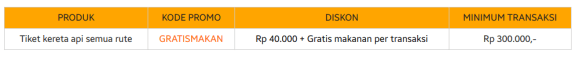 Khusus tahun ini ada dua promo menarik  jika kamu membeli tiket kereta api di tiket.com, syaratnya  hanya perlu melakukan transaksi  dia atas 300 ribu rupiah dengan menggunakan aplikasi. Lumayan kan dapat makan di kereta api plus potongan 40 ribu rupiah. Silakan catat ya kode promo di bawah.