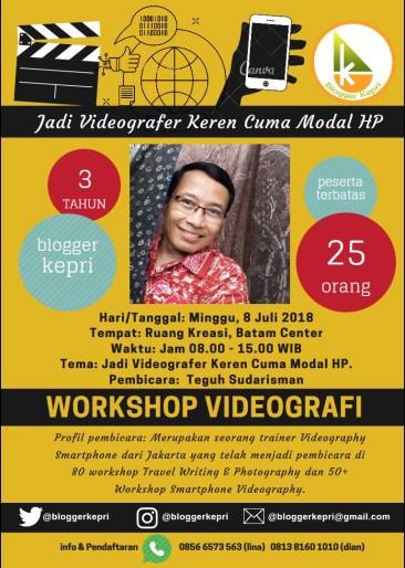 Jalan2Cuap2 – Bulan Juli lalu komunitas Blogger Kepri mengadakan workshop videografi bertajuk ” Jadi Videografer Keren Cuma Model HP” dengan pembicara travel writer terkenal Teguh Sudarisman.Acara seru bagi 25 peserta ini tak hanya mengajarkan teknik pengambilan gambar dengan video dengan kamera tapi teknik editing tips dan trik membuat hasil video ponsel terlihat profesional. Berikut dokumentasi aktivitas teman-teman yang mengikuti workshop di Coworking Space Ruang Kreasi Batam.