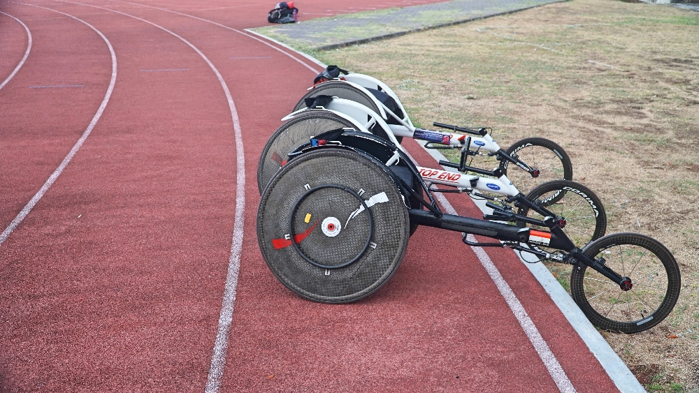 Kursi roda milik para atlet sudah dipersiapkan di tepi lapangan.