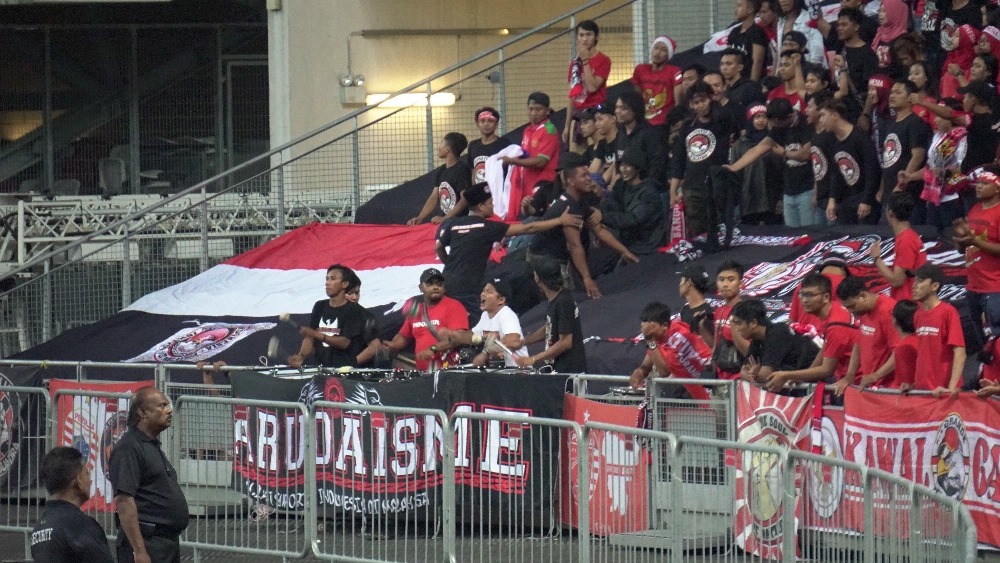 Meski dukungan para supporter sangat maksimal tapi hingga turun minum skor tetap 1-0 untuk Singapura.