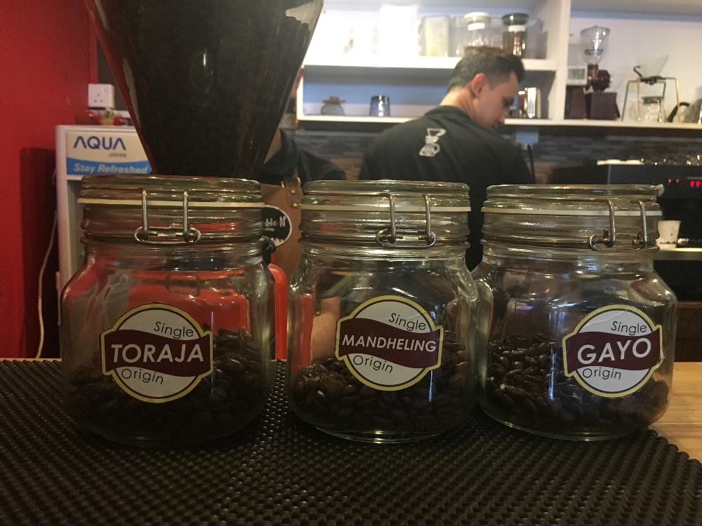Tak perlu keliling Indonesia bahkan dunia jika ingin mencicipi aneka rasa dan aroma kopi. Cukup duduk manis di Double N Coffee lalu memilih biji kopi di dalam toples-toples kecil di depan barista. Siapa yang akan kau puja hari ini, si asam kuat Gayo atau si asam kelat dari Toraja. Kalau saya memilih si Mandheling dengan rasa yang tak terlalu kuat tapi mampu meninggalkan kesan di hati.