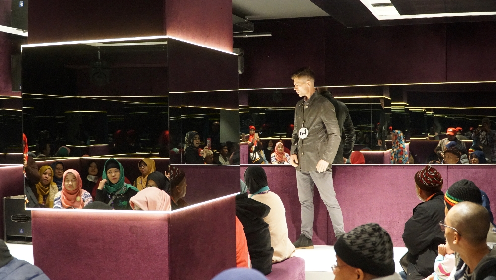 Tak berapa lama musik dengan nada ritmis dimainkan, model pria dan wanita berjalan bergantian menyusuri catwalk sembari memperagakan beberapa koleksi terbaru. Tak dapat dipungkiri kita orang Indonesia terlalu gampang terpuka dengan wajah khas ras kaukasoid.