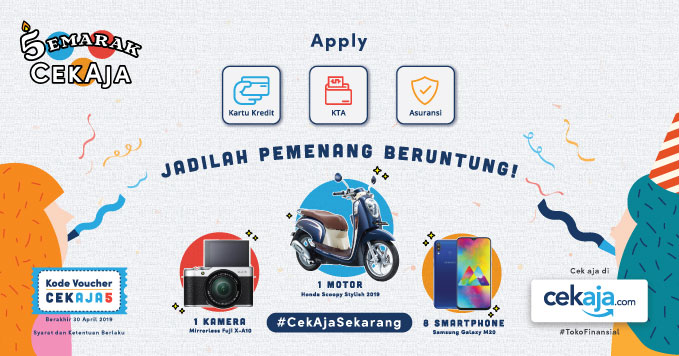 Hai traveler! Dalam rangka memperingati ulang tahun CekAja.com yang ke-5, ada banyak hadiah yang menanti kamu. Mulai dari Sepeda Motor Scoopy terbaru, Kamera Mirrorless Fuji X-A10, 8 Smartphone Samsung Galaxy M20, dan gratis ribuan asuransi perlindungan kecelakaan diri. Gimana caranya? Cukup ajukan Kartu Kredit, KTA, atau Asuransi, dan masukkan kode voucher “CEKAJA5” untuk mendapatkan kesempatan rebut hadiah utama!