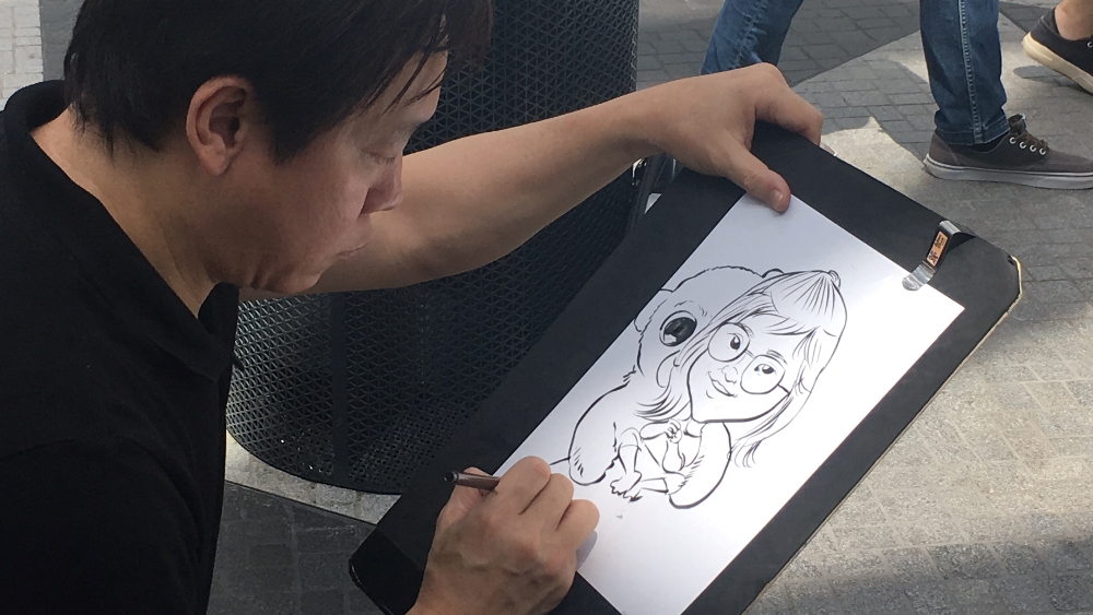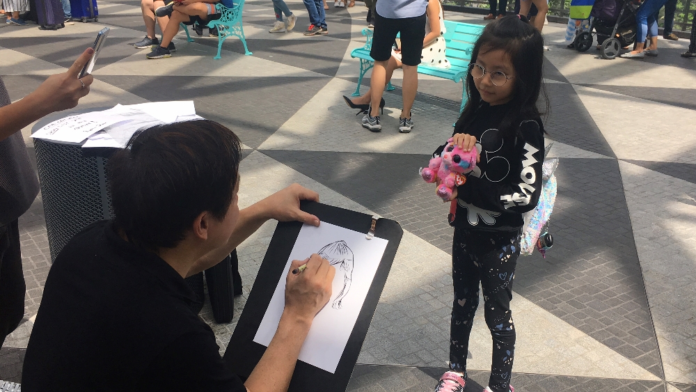 Hal lain yang meninggalkan kesan mendalam ketika jalan-jalan ke Jewel ada perjumpaan dengan seorang kartunis bernama Adam Chua. Pria berusia 40 tahunan ini dengan piawai menggambar pengunjung anak-anak hanya dalam 3 menit saja. Dan semua ini gratis tanpa dibayar oleh pengunjung atau tamu, sepertinya pihak Jewel yang membayar Adam.