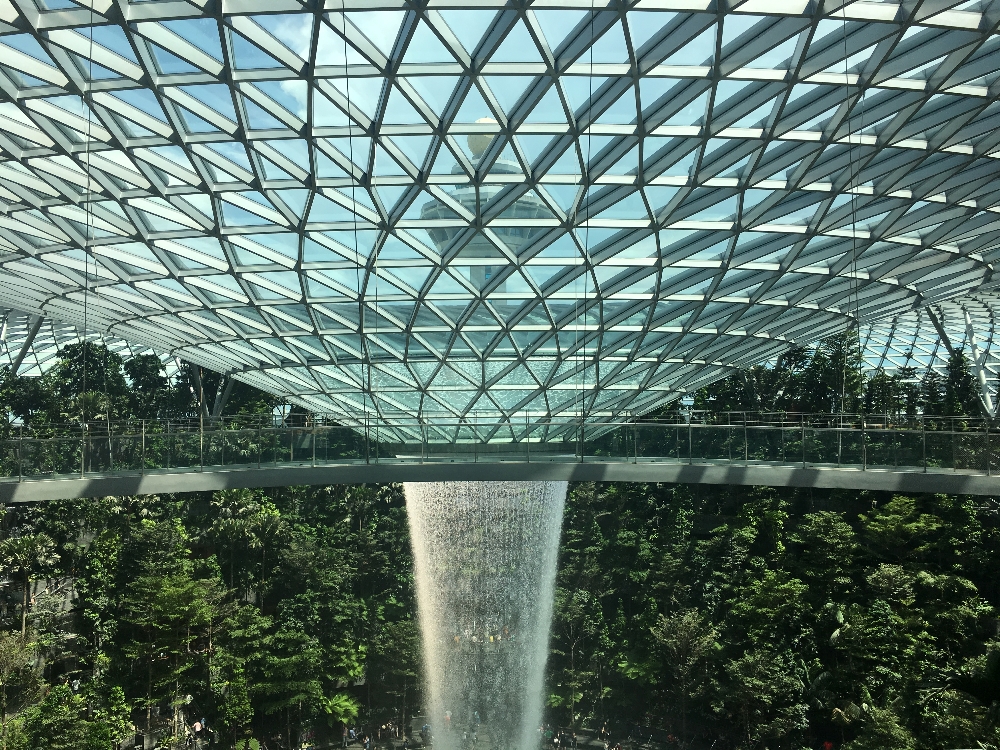 Teman saya yang paham soal kontruksi berujar ” Bayangakan atap Jewel tanpa penyangga di tengahnya terbentang sejauh puluhan meter dengan beban air mengalir. Sungguh perhitungan kontruksi yang luar biasa membagi gaya ke bawah ke kisi-kisi pinggir atapnya. Luar biasa!”