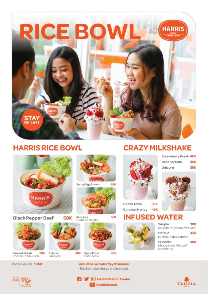 HARRIS Rice Bowl memiliki 6 varian rasa yaitu : Black Pepper Beef, Sambal Matah Chicken Fried Noodle, Balacan Fried Rice, Spicy Fried Flat Noodle, Rica-Rica Fried Fish Noodle dan Salted Egg Prawn.