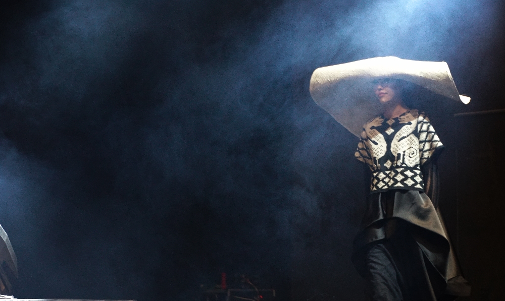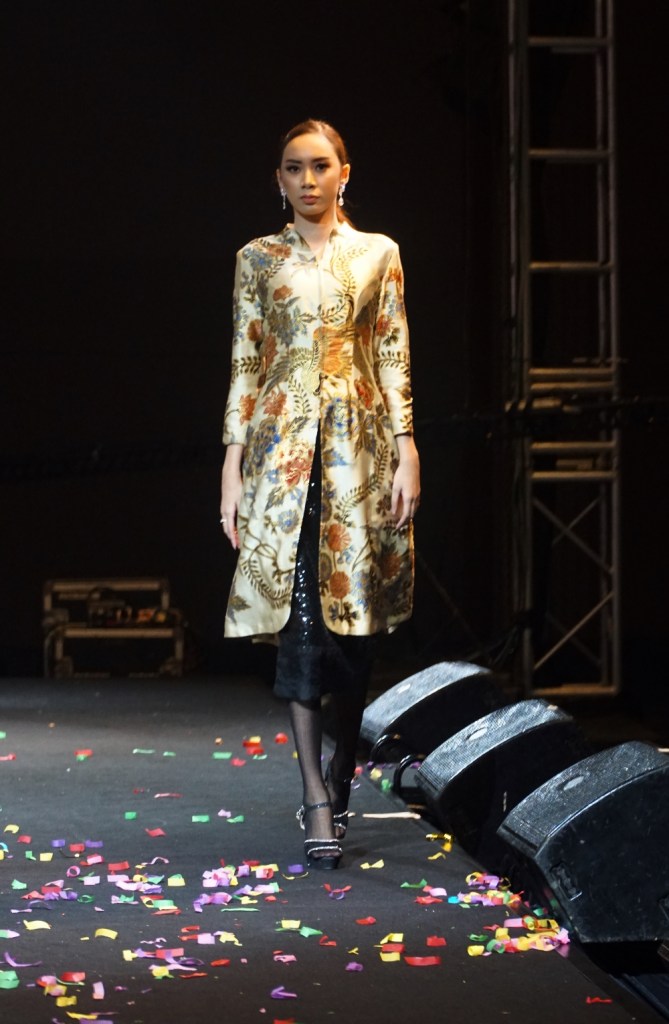 Gaun model kemben dengan detail kain tradisional tumpuk membuat tampilan Yuka senada dengan tampilan model yang mengenakan baju rancangan Dana Duriyatna.