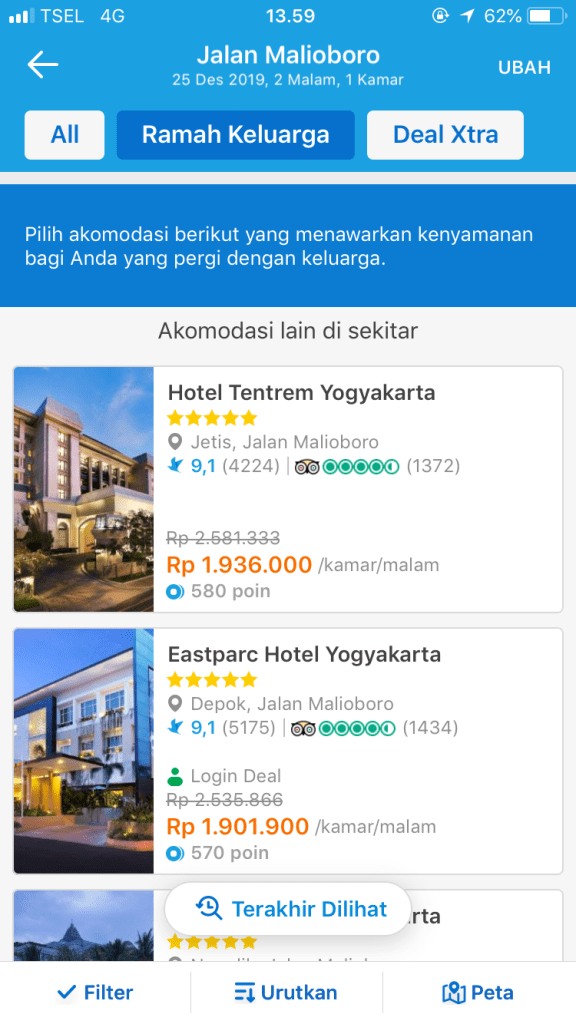 Sebagai paman, adik dan anak yang baik saya harus mengabulkan seluruh keinginan anggota keluarga. Ya sudah daripada harus mengulik satu-satu kamar hotel di Jogja melalui mesin pencari. Saya menggunakan aplikasi traveloka dengan fitur filter kamar sesuai dengan kebutuhan. Mau hostel murah semurah-murahnya dengan fasilitas minimalis sampai hotel bintang lima ala Sultan bisa dicari dengan mudah.