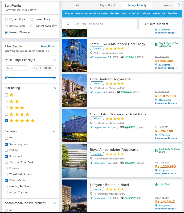 Saya kebagian tugas untuk memesan kamar hotel dengan fasilitas lengkap dengan beberapa syarat. Ponakan saya mau hotel dengan fasilitas kolam renang dan kalau bisa di rooftop dengan pemandangan indah. Sedangkan kakak ipar saya maunya ada fasilitas dan spa dan fitnes. Sedangkan orang tua saya mau kamar luas dengan balkon. Ibu dan kakak berpesan kalau bisa kamar-kamar dengan connecting door.