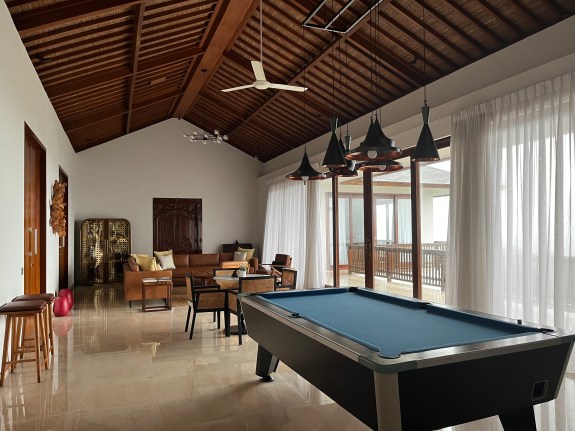 - Upper floor living room with a custom private bar, pool table & designer leather sofas