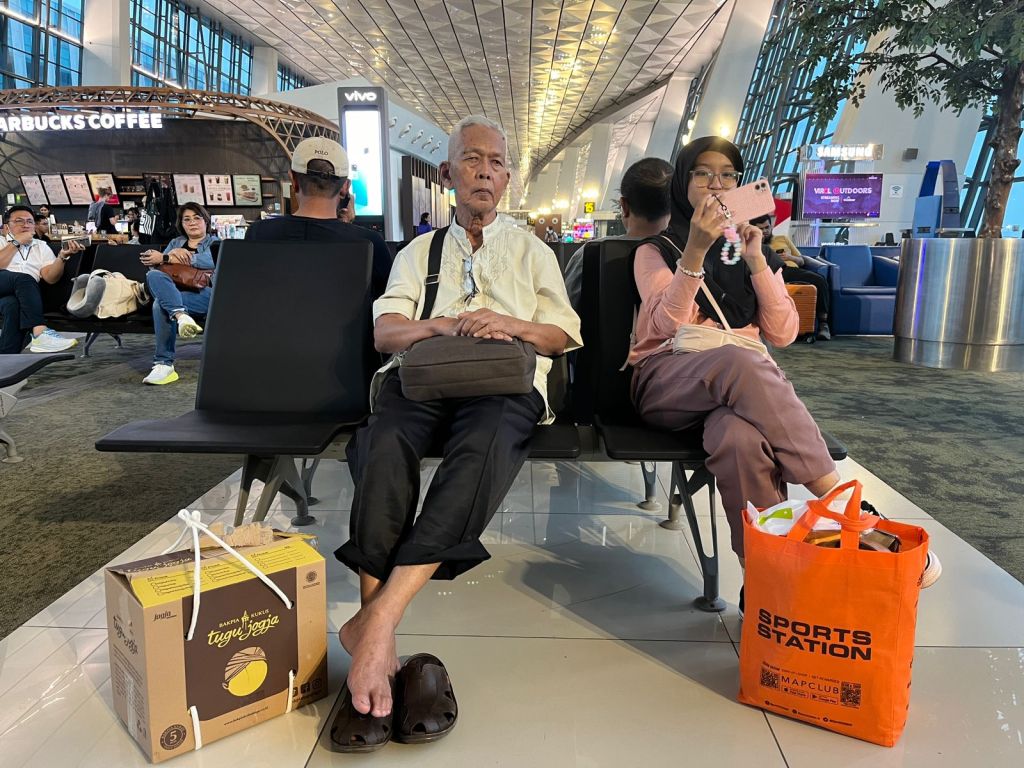 “Naik kursi roda atau gimana…” menggoda bapak yang berjalan semangat keluar bandara.