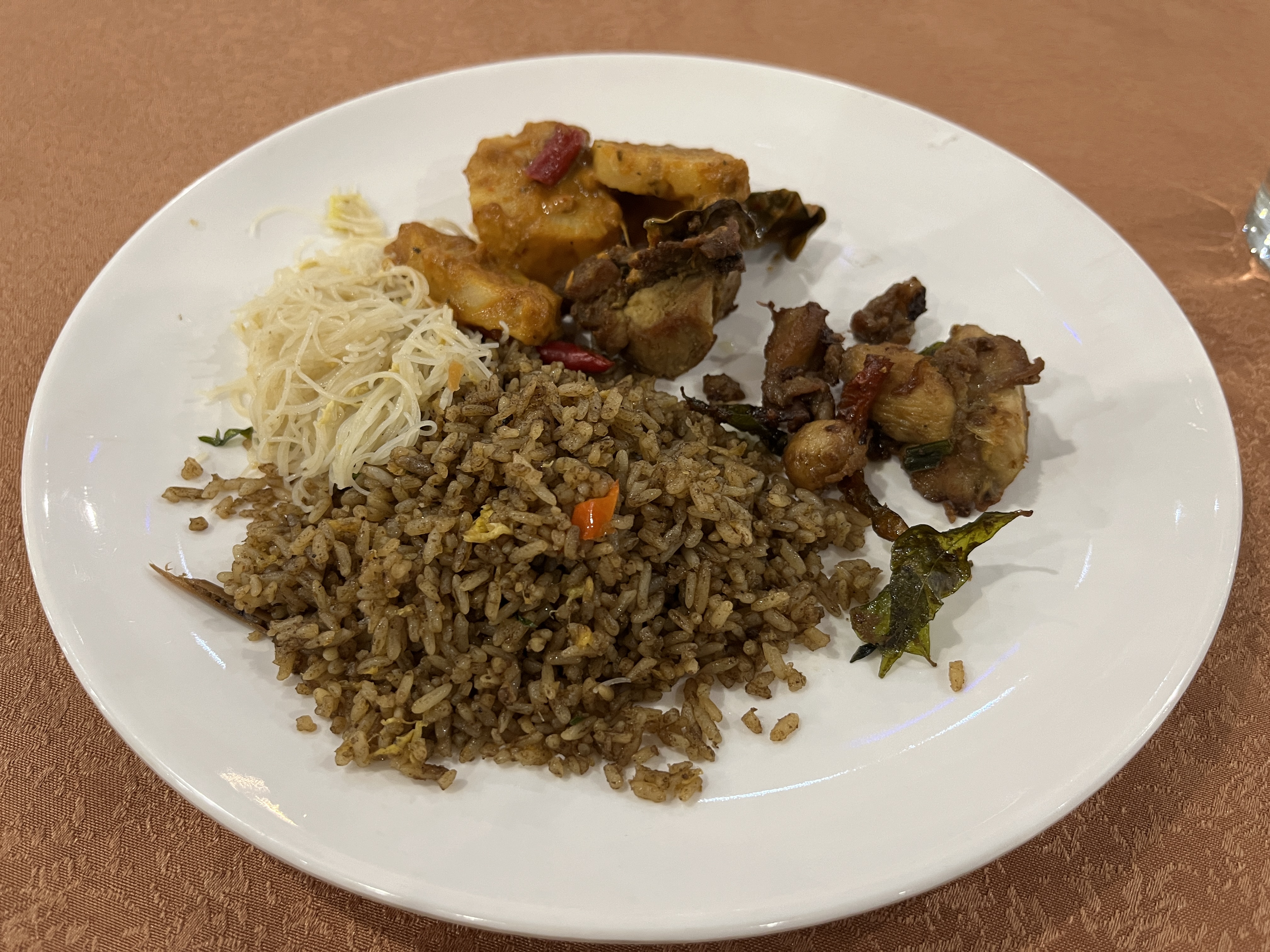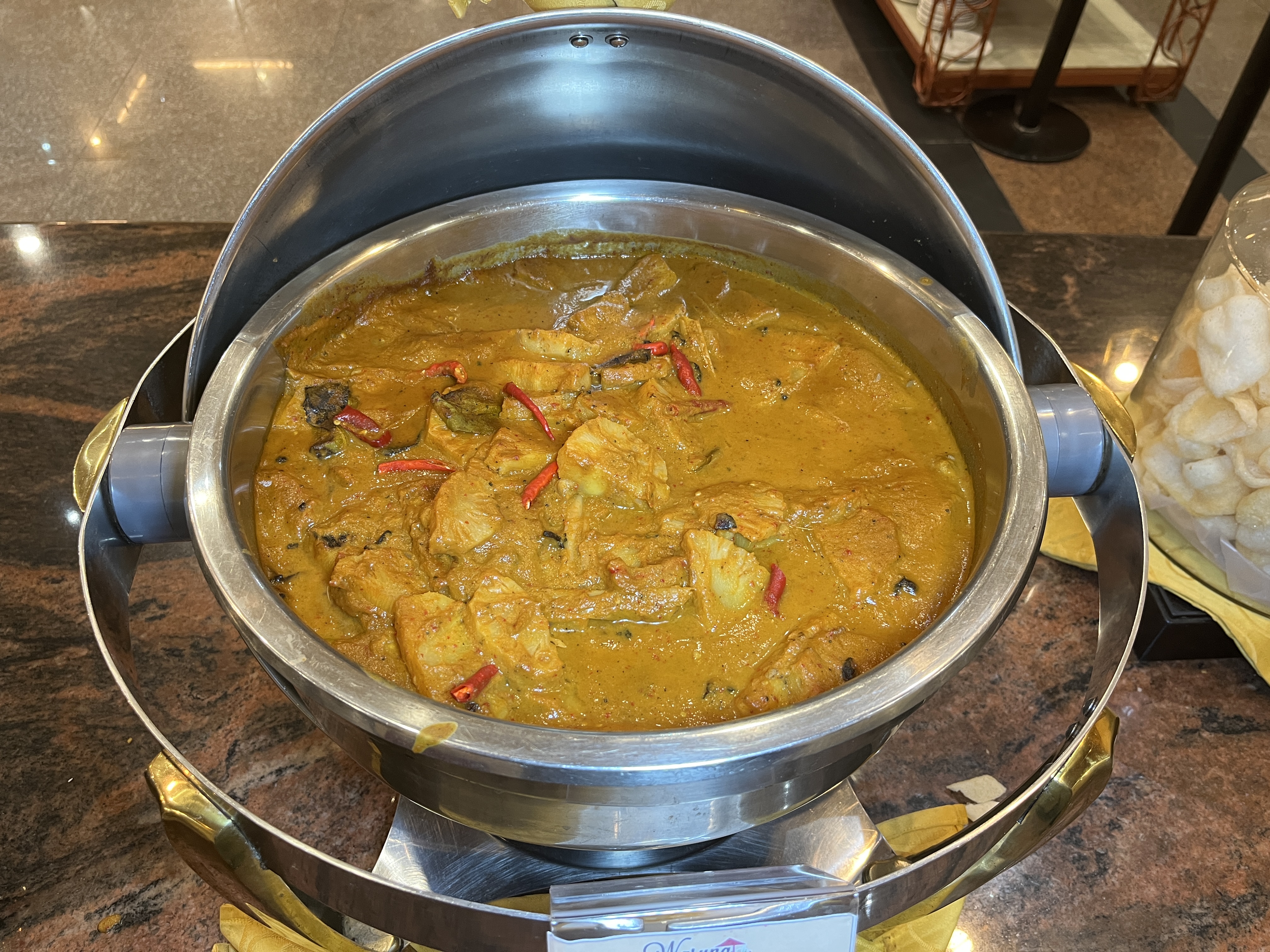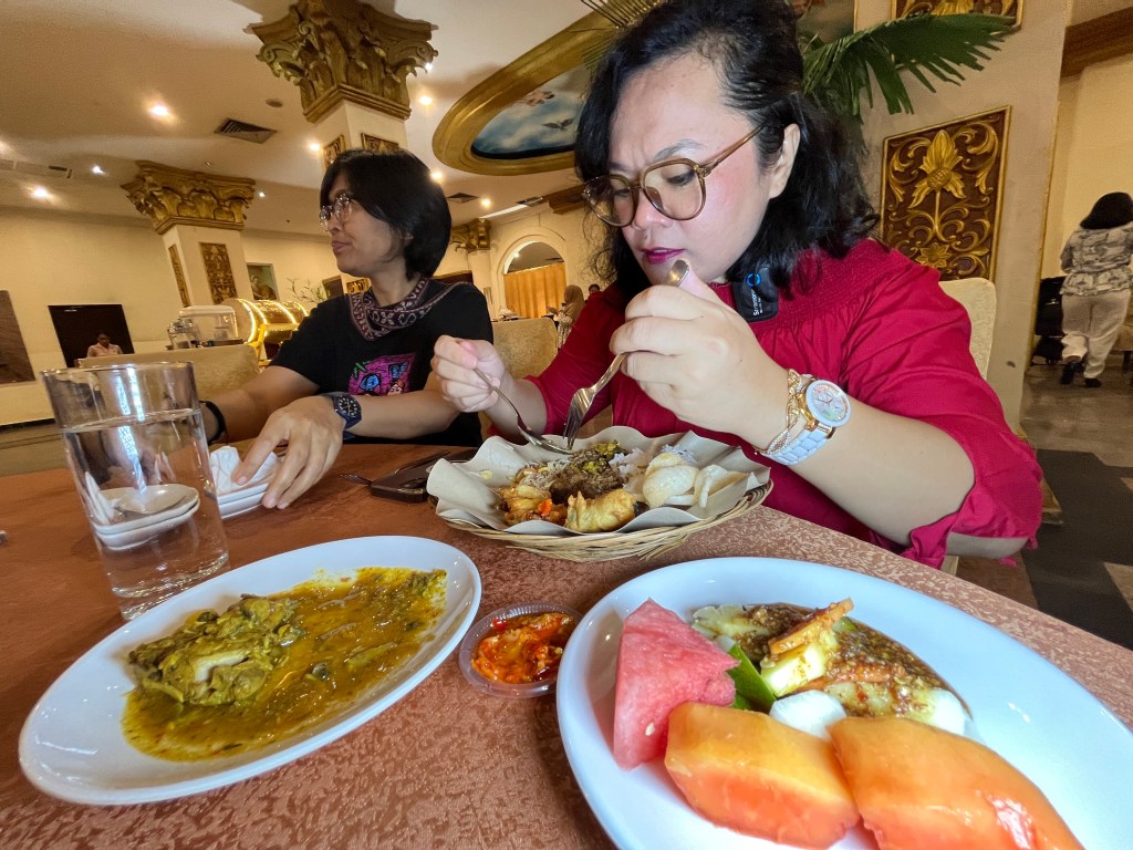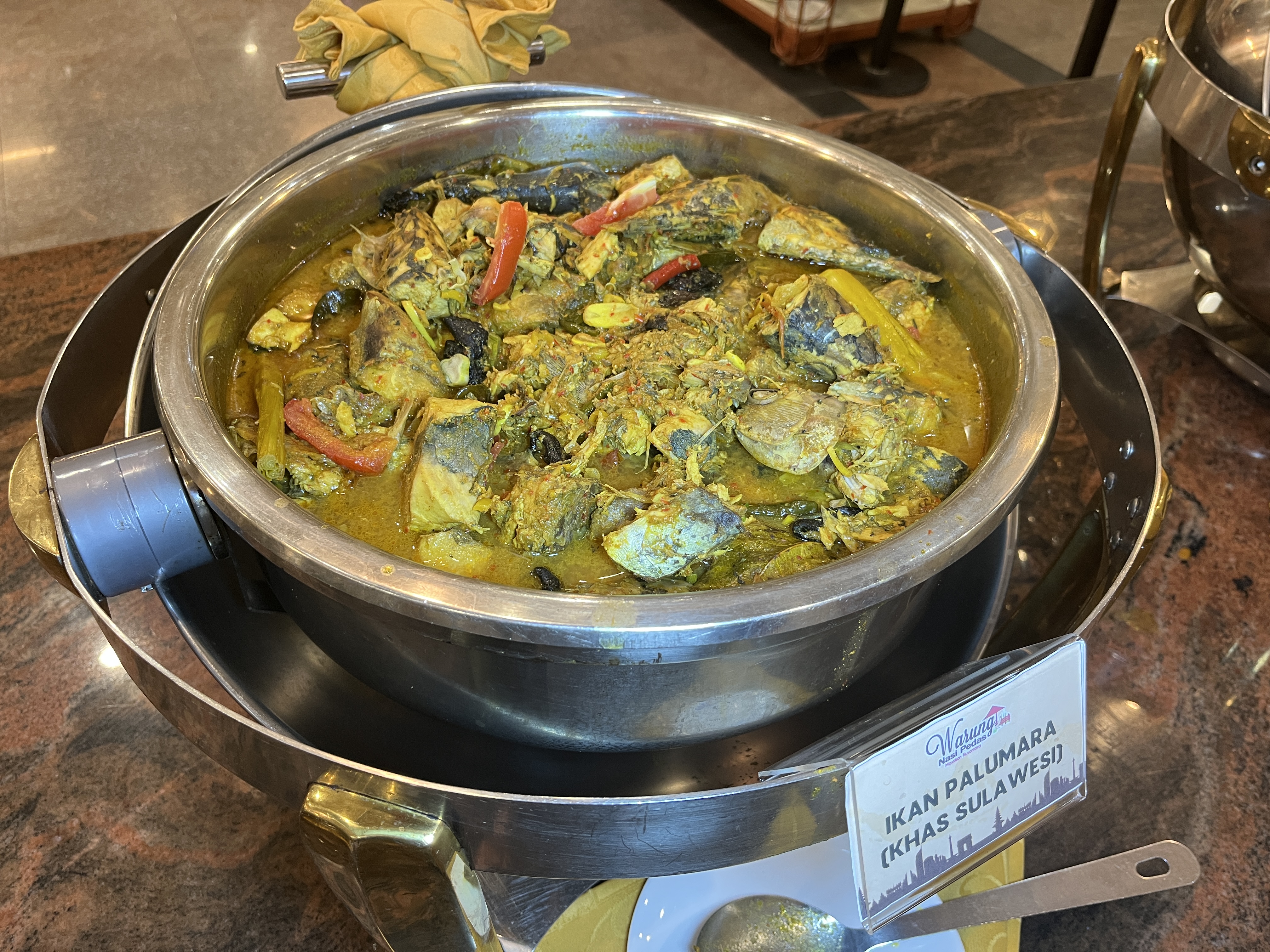 Menu hari ini ada nasi goreng rawon yang cita rasanya pas banget sama selera saya yang masih ada darah Jawa Timuran. Nah paling jos dipadukan dengan ayam lepas dari Aceh yang rasanya gurih manis sedap. Tapi favorit saya Pallumara dari Sulawesi , ikan bumbu rempah mirik arsik tapi agak sedikit kuat. Secara cita riasa mirip pindang tapi nggak terlalu asam, ada aroma daun jeruk , sere yang kuat . Kalau arsik menggunakan ikan air tawar ini ikan tongkol yang teksturnya lebih padat dan kenyal. Duh kalau ditambah daun kemangi pasti jos gandos. Sebagai pendamping tersedia mie soun berbumbu gurih , soto atau sup.