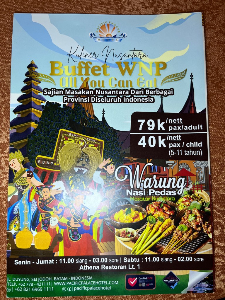 Selain menu makan di restaurant, Pacific Palace Hotel juga menyediakan aneka buah tangan makanan tradisional Indonesia. Pas banget kan buat yang liburan di Batam dan bingung mau cari oleh-oleh dimana. Pulang Dinner, Brunch atau Lunch langsung intip yuk aneka jajanan yang bisa dibawa pulang seperti lapis legit, aneka cake, onde-onde aneka rasa dan kue semprong dengan packaging menawan pas dibawa sebagai buah tangan.