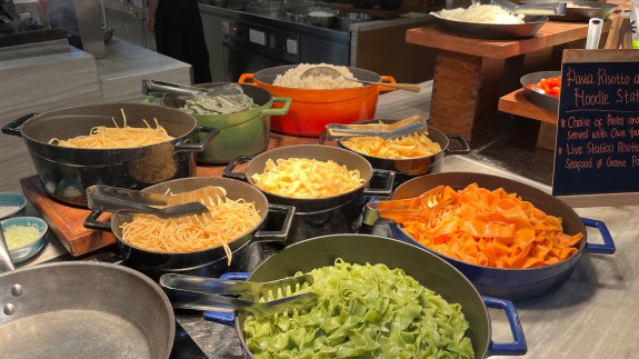 Sajian makanan timur dan barat berpadu dalam buffet dinner spesial. Salah satu yang aku higlighy adalah live cooking pasta. Pelanggan bebas memilih pasta dan isiannya lalu dimasak langsung di depan bar dengan cara yang tidak biasa. Hatiku benar benar meleleh ketika pasta dimasukan ke dalam keju yang ditorching.