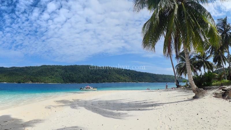 Impian tentang Anambas terwujud. Langit biru, pasir putih dan air dalam gradasi tiga warna: biru muda, hijau toska dan biru tua. Berhamburan menuruni kapal , berlarian bagai anak kecil , kami menjejakan kaki di pantai berpasir sehalus tepung terigu.